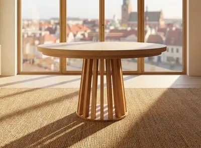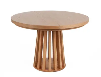 Veltu to okrągły stół rozkładany lub nierozkładany - do wyboru. Stół Veltu może być rozkładany nawet do 280 cm długości. Na co dzień nieduży, zgrabny stół rozkładany o średnicy 110 cm, 120 cm lub 130 cm, a po włożeniu 3 wstawek osiąga długość nawet 280 cm, dzięki czemu można ugościć dużą grupę przyjaciół, czy też liczną rodzinę. Stół wykonany jest z drewna bukowego lub dębowego oraz naturalnych fornirów bukowych lub dębowych. Bogata paleta wybarwień umożliwi dobranie koloru pasującego do pozostałych mebli w naszym mieszkaniu. Stabilność zapewniają wytrzymałe prowadnice teleskopowe, a w przypadku stołu z 3 wstawkami stosowane są specjalne dodatkowe nogi, które rozstawiane są dopiero przy większym rozłożeniu.